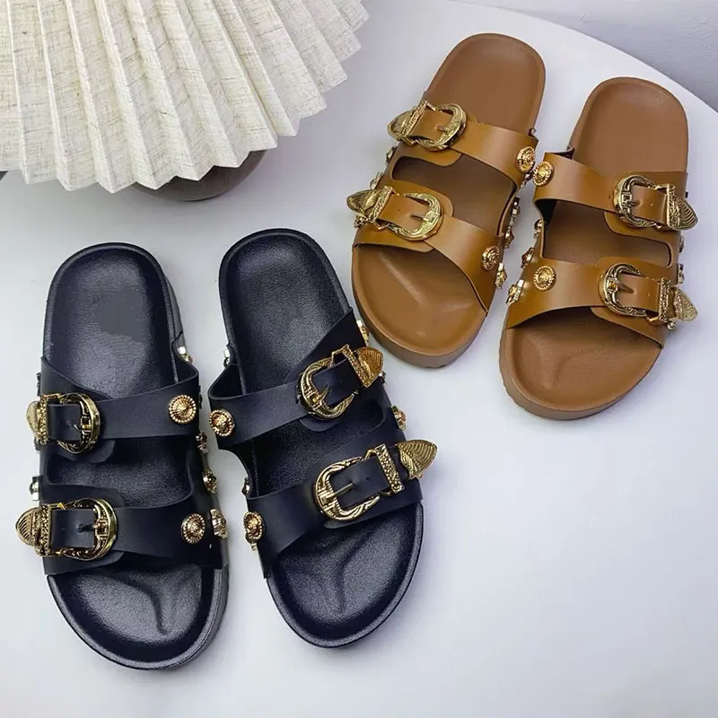 Check out this metallic-textured double-buckle design, available in rose red, black gold, and golden brown – four colors to choose from. Wearing these, you're instantly the street's focal point, a perfect match with shorts or dresses!